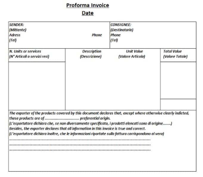 1. assicurati che il modulo riporti chiaramente la dicitura “proforma invoice” (fattura proforma): proprio perché i due modelli di fatture, quella proforma e quella commerciale sono fondamentalmente identici, è importante differenziarli e comunicare chiaramente alle autorità doganali straniere il tipo di fattura che si sta emettendo in inglese, possibilmente all’inizio ben in alto e visibile nel documento.